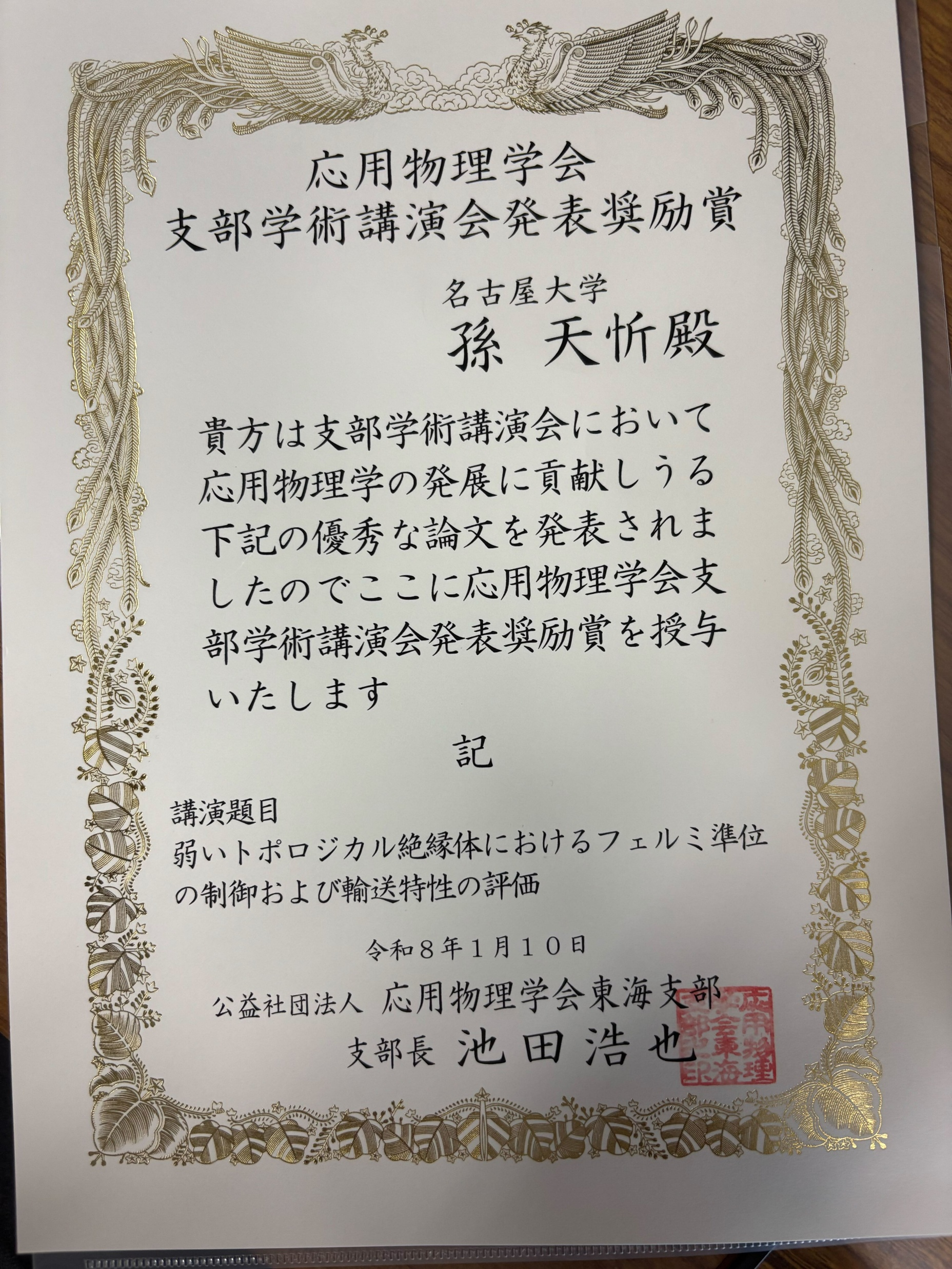 1/10 第12回応用物理学会 名古屋大学スチューデントチャプター 東海地区学術講演会での発表で奨励賞を受賞しました!おめでとうございます!